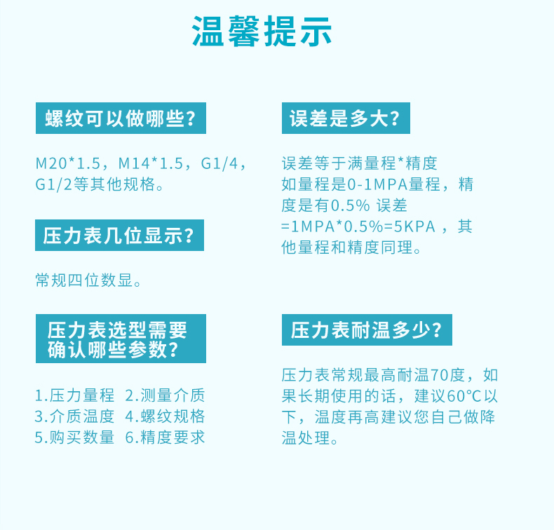 適用場合:米科MIK-Y290/MIK-Y190智能數顯壓力表可測水壓、液壓、氣壓、油壓等,廣泛應用于石油、化工、冶金、輕紡、造紙、環保、食品等領域的壓力測量。咨詢熱線:400-163-1718