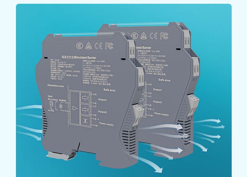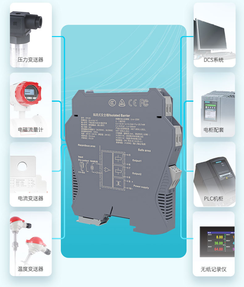 適用場合:本產生是通過干接點、集電極開路信號控制輸出,驅動危險區的本安小功率設備。如電磁閥、聲光報警器等本安設備。輸入端、輸出端及電源端三方隔離。本產品具有可靠性高、響應快等諸多優點。可與各類儀表及 DCS、PLC 配套使用。