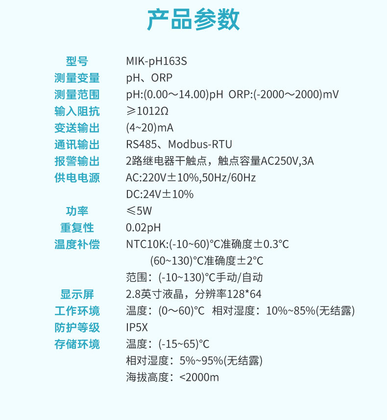 適用場合:紡織印染、工業(yè)廢水、自來水廠、污水處理廠、電鍍廢水等液體PH測量。 MIK-PH163儀表實(shí)現(xiàn)4-20mA信號(hào)輸出、繼電器報(bào)警輸出以及RS485通訊,搭配PH上位機(jī)軟件,可實(shí)現(xiàn)對多臺(tái)PH控制器聯(lián)機(jī)進(jìn)行系統(tǒng)性監(jiān)控的功能。