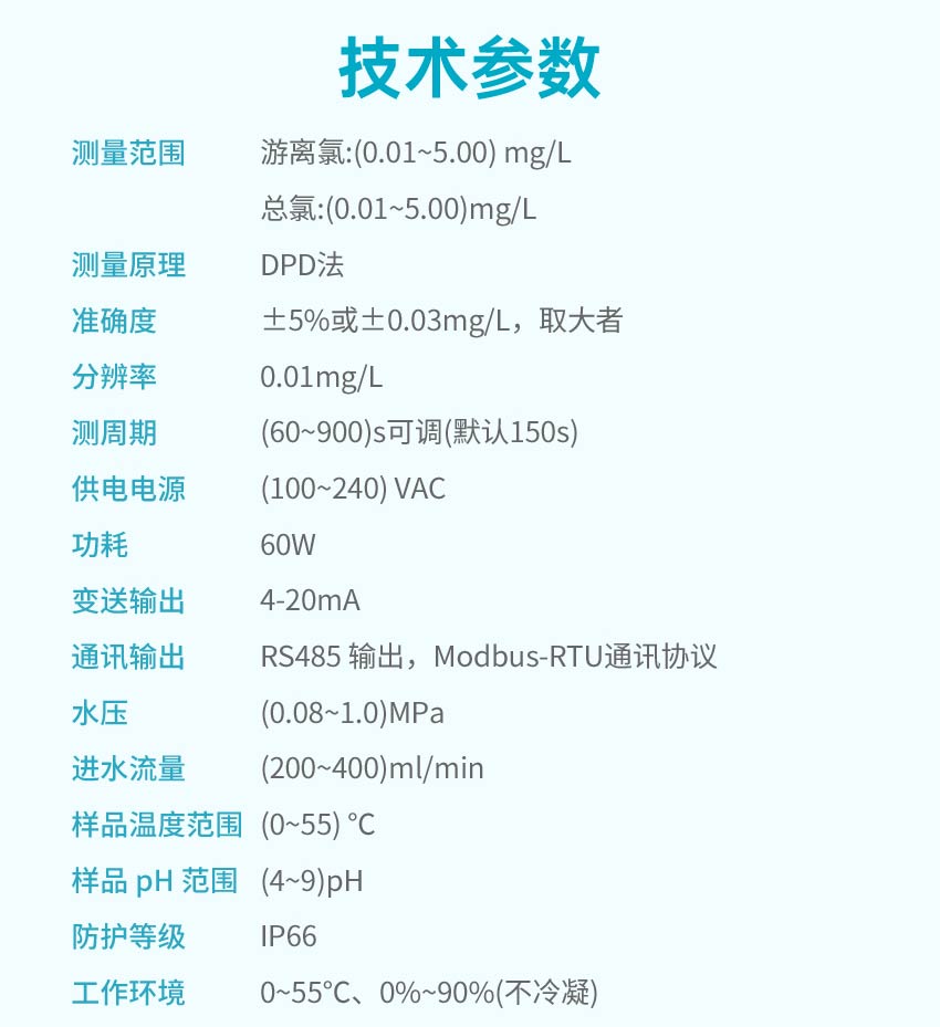 適用場合:余氯在線分析儀是一款對水中游離氯、總氯進行準確測定的一款儀器。廣泛用于自來水廠、自來水管網、游泳池、冷卻循環水、水質處理工程等水溶液中余氯含量的連續監測和控制。
