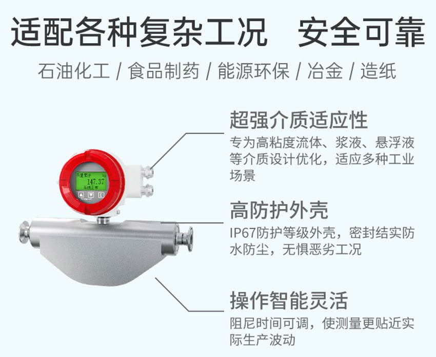 適用場合:科里奧利質量流量計是根據科里奧利力原理開發的一種新型的流量測量儀表,可直接測量封閉管道內流體的質量流量、介質的密度和溫度。可廣泛應用于化工、石油、食品、制藥、造紙等行業。